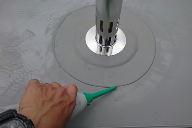 脱気筒のツバに金属下地用のプライマーを塗布したら、脱気筒のツバの外周やビス頭、筒の根元に沿って、丁寧にウレタンシーリング材で塞いでいきます。