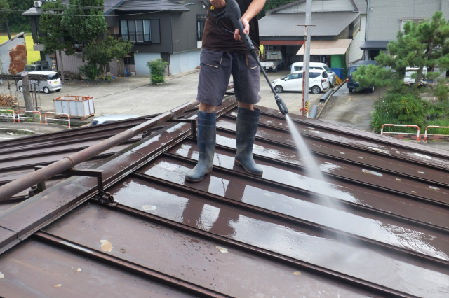 汚れがついたままの屋根に塗装すると仕上がりに差が出るだけでなく、施工後のトラブルにもつながる恐れがあります。そのため、まずは屋根に付着した汚れやコケを高圧洗浄機で丁寧に洗い流します。